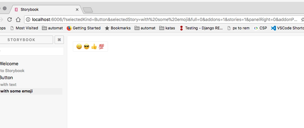 // A second story to show what the button looks like with emojis. .add('with some emoji', () => <Button onClick={action('clicked')}>😀 😎 👍 💯</Button>);That’s pretty much all there is to writing stories. It’s really easy to use and such a great tool. In my next post, we’ll dig into some of the cool features of Storybook.