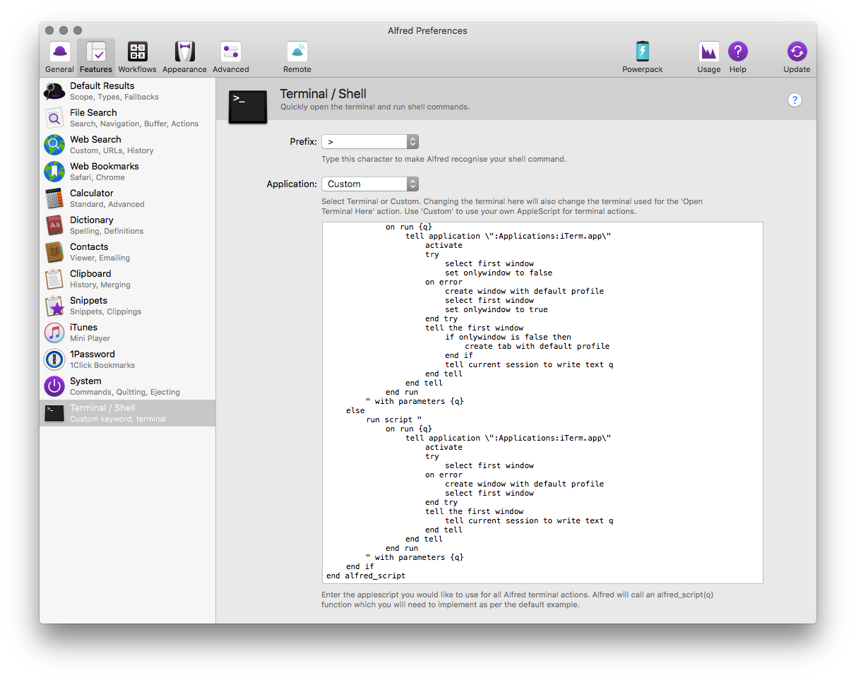 You can also launch the terminal from Alfred, by typing > in the Alfred search bar followed by the command you wish to run. Since I use iTerm, I want that to open instead of the default Terminal app. Since Alfred 2.7.2, you can run a custom Applescript to launch another terminal application. Open the Alfred preferences window and click on the Features button in the top of the preferences window then click on the Terminal / Shell button at the bottom. In the Application drop down menu, select Custom and paste in this script from the Custom iTerm Applescripts for Alfred repository.