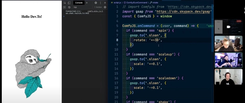 On , DEV Community member Jhey Tompkins joined @coffeecraftcode and I on the pairing stream to have some fun and help us build out a Twitch overlay using our mascot, Sloan!